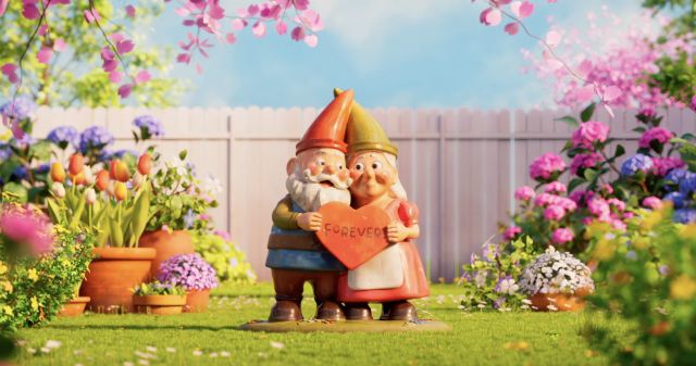 While golfers play on the other side of the fence, peaceful garden gnomes find themselves attacked by stray golf balls.